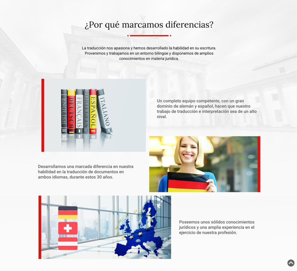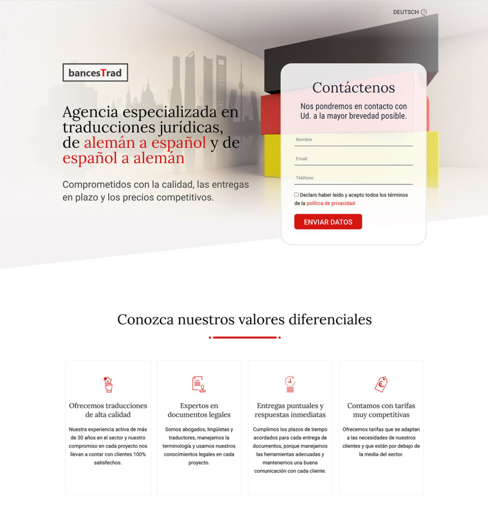 Landing multi-idioma (español y alemán) desarrollada en WordPress que ofrece el contacto directo a destacados profesionales  en traducciones jurídicas, de alemán a español y de español a alemán.